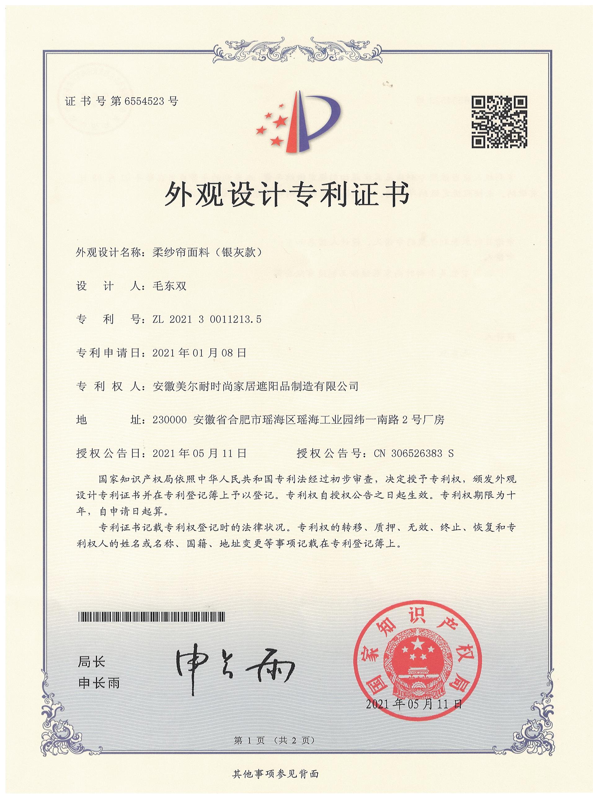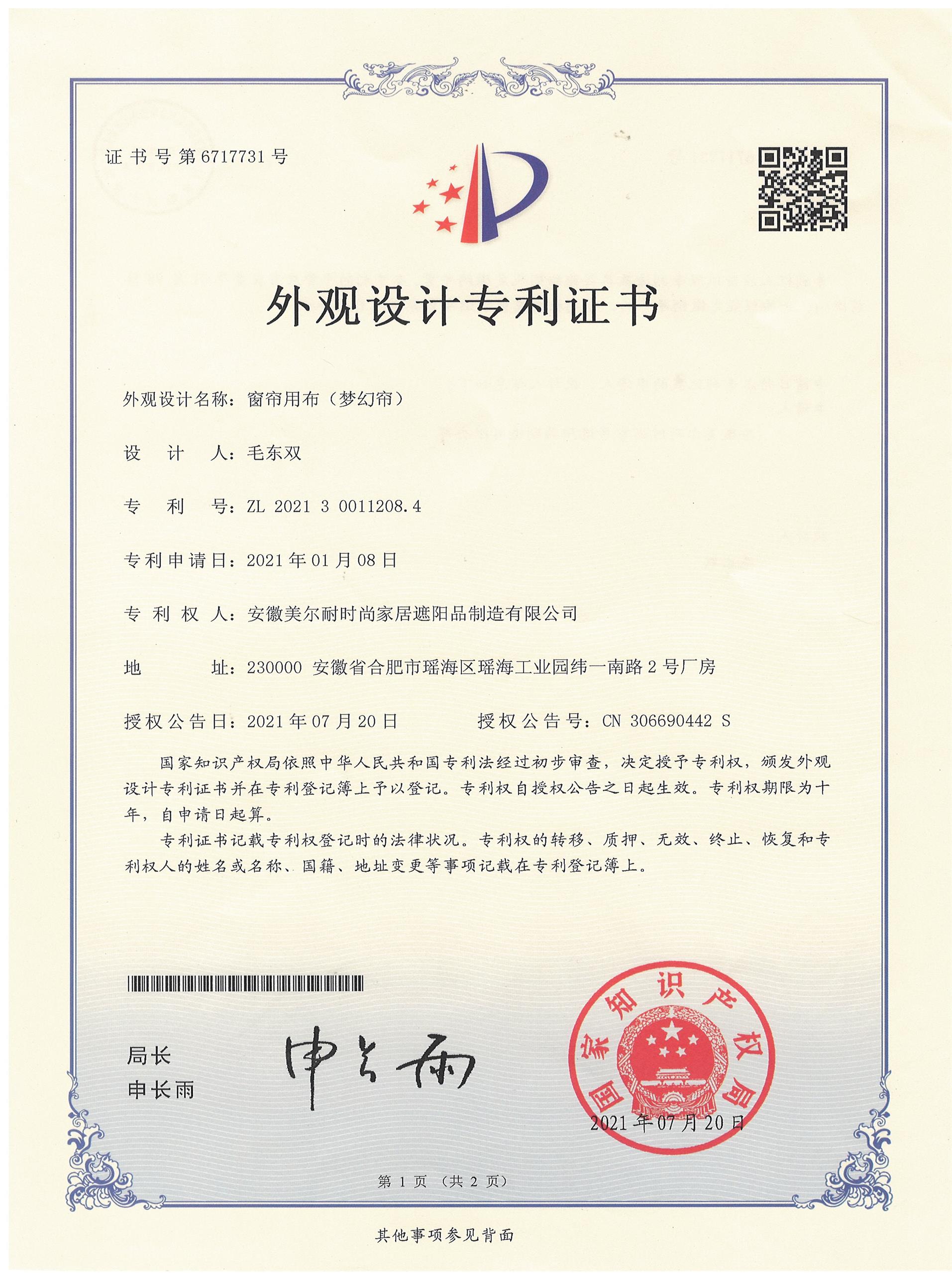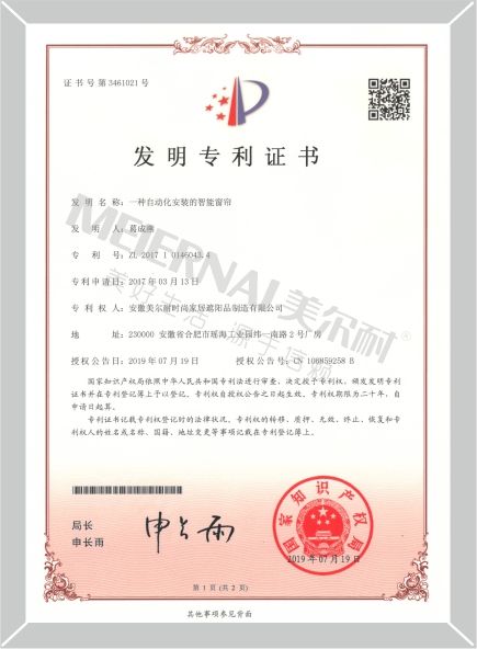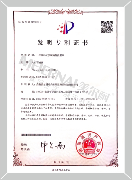 《智能窗簾》外觀設計專利證書