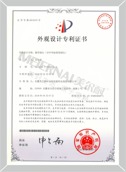 《窗簾制頭》外觀設計專利證書