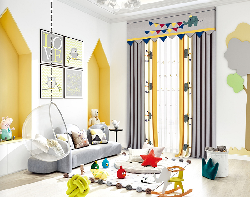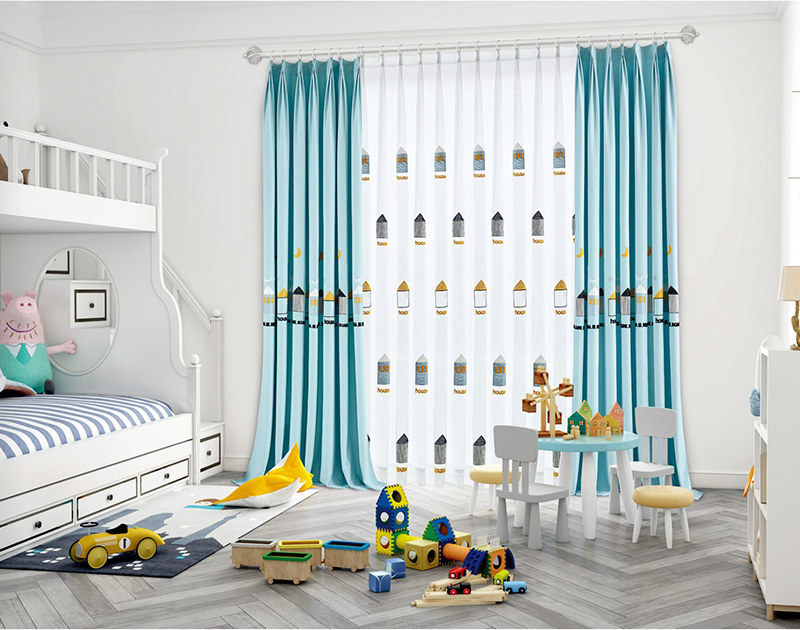 兒童房的窗簾*好選用雙層窗簾,在白天陽光過于充足時,用薄窗簾遮擋,在夜間用厚窗簾,給寶貝一個安靜的睡眠環境。