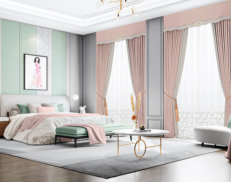 如果說客廳窗簾要對客人說話,那么臥室的窗簾就是專門為主人設(shè)計(jì)的。溫馨、浪漫、私密的臥室空間中,窗簾除了裝飾作用外,更主要的保護(hù)隱私、調(diào)節(jié)光線。臥室窗簾可以選擇深色布料,遮光性好,而且能起到促進(jìn)睡眠的作用,尤其是黑紅搭配的窗簾對于失眠者是不錯的選擇。