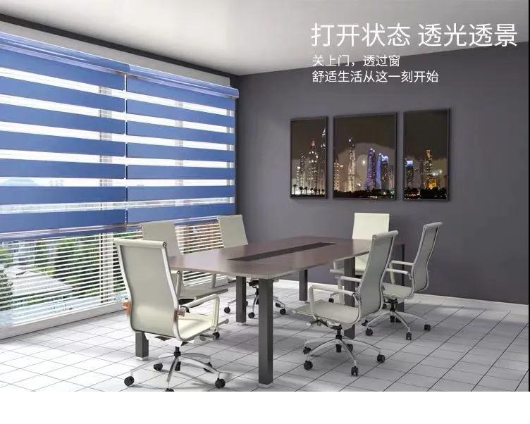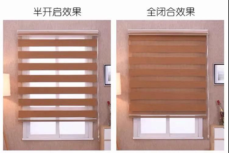 斑馬簾和百葉簾調節光線的效果和方式都錯不多的。和百葉簾不同的是斑馬簾是雙層設置,當紗布和紗布重合時光線比較柔和,一定程度上減少光的直射。當簾布和簾布錯開時,光線完全遮住,從而最終達到遮擋光線的目的。需要完全打開窗簾時,窗簾完全卷起即可。