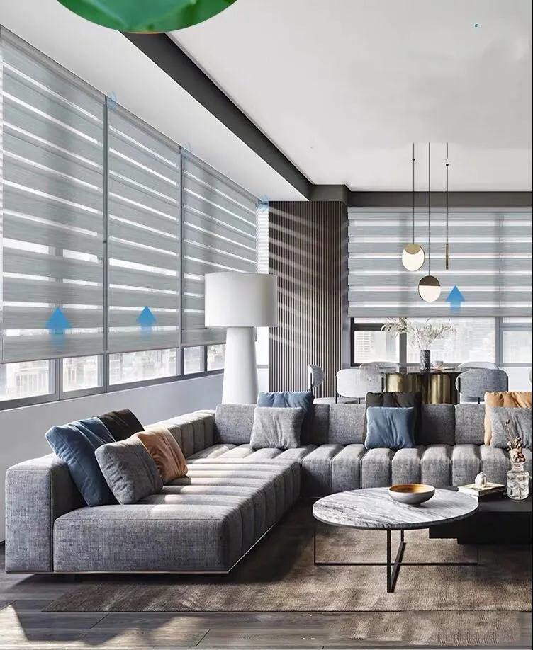 斑馬簾又名柔紗簾,彩虹簾,柔麗絲,調光卷簾,雙層卷簾。一小片一小片寬度相等的面料和紗布相互間隔織成的一種紡織物,通過一端固定,另一端隨軸卷動的而達到調節光線的目的。本期就來給大家分享斑馬簾的特點以及案例效果圖!